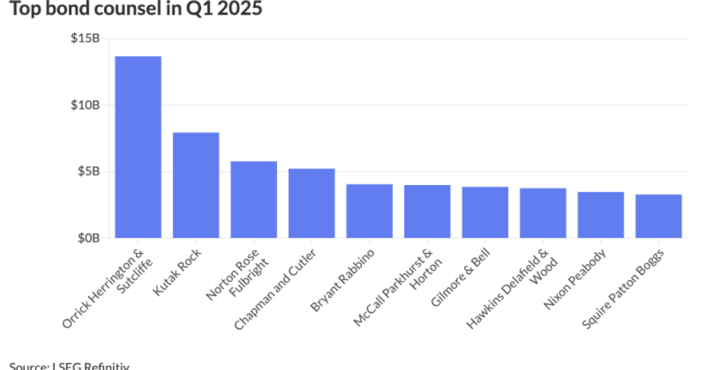 Orrick Herrington & Sutcliffe remained in first as the top bond counsel for the first quarter of 2025.