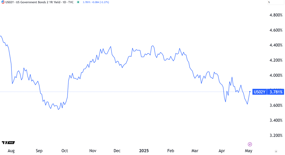 Unlike the 10-year Treasury yield, which has been volatile in 2025, the 2-year yield has been on a relatively smoother decline since January.